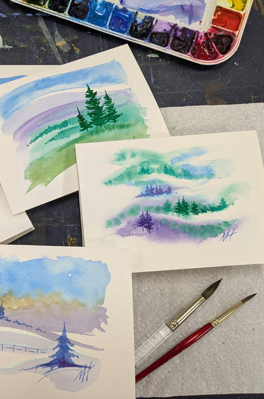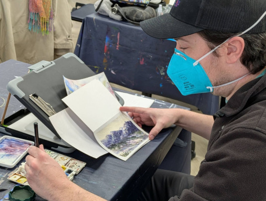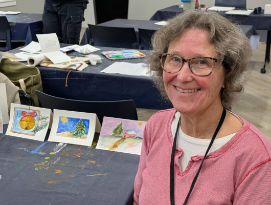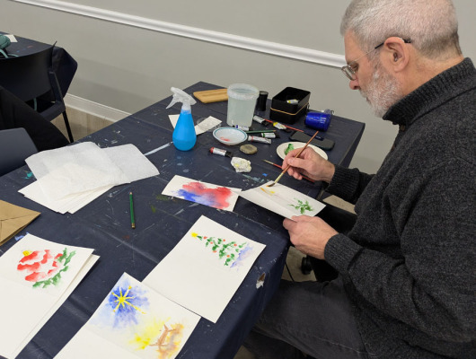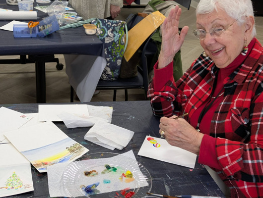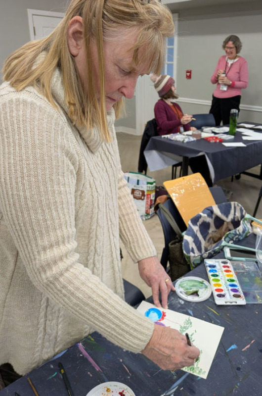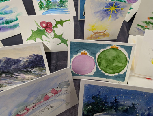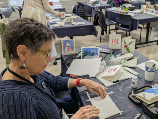 Our December member meeting featured a holiday card painting party! Members brought their portable paint gear and painted a beautiful variety of holiday cards with heartfelt messages that will be delivered hospitalized veterans at Cincinnati's VA Hospital. Card stock and envelopes were provided by the Society. Members brought holiday snacks to share, and coffee and tea were generously provided by the good people at ArtsConnect.